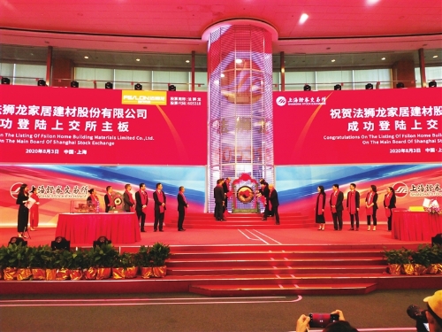 8月3日,法狮龙家居建材股份有限公司上市仪式在上海证券交易所隆重举行。9点30分,伴随着一声响亮浑厚的锣声,法狮龙成功登陆上交所A股主板,成为海盐第5家上市企业。嘉兴市副市长盛全生,县委书记陈玲芳,县委副书记、县长王碎社等领导出席上市仪式,共同见证法狮龙这一重要时刻。